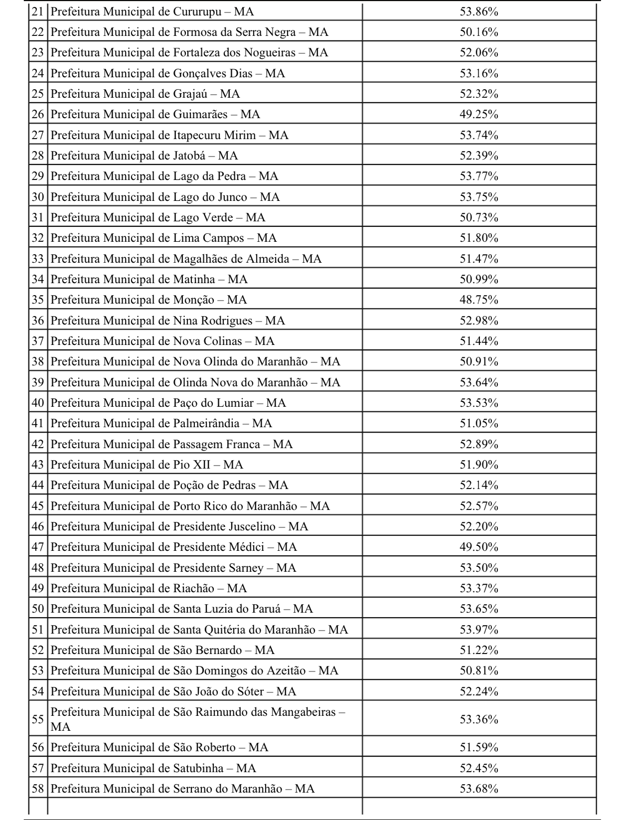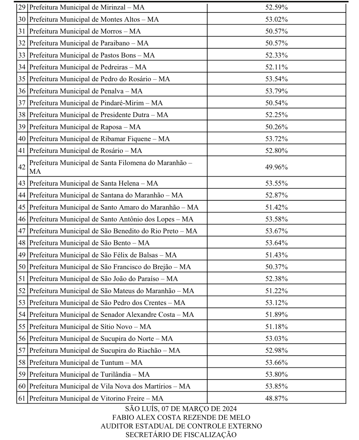 “Informamos que as Prefeituras abaixo estão acima do Limite Máximo de despesa com pessoal. Os Poderes Executivos Municipais elencados abaixo estão acima o Limite Máximo no que tange ás despesas de pessoal, logo isso os obriga a cumprir as exigências previstas no parágrafo 1° do art. 23 da LRF c/c com inciso I do parágrafo 3° do art.169 da CF/1988, além de estar sujeito ás infrações previstas na Lei n° 10.028/2000, onde no seu art. 5°, Inciso IV” constatou.