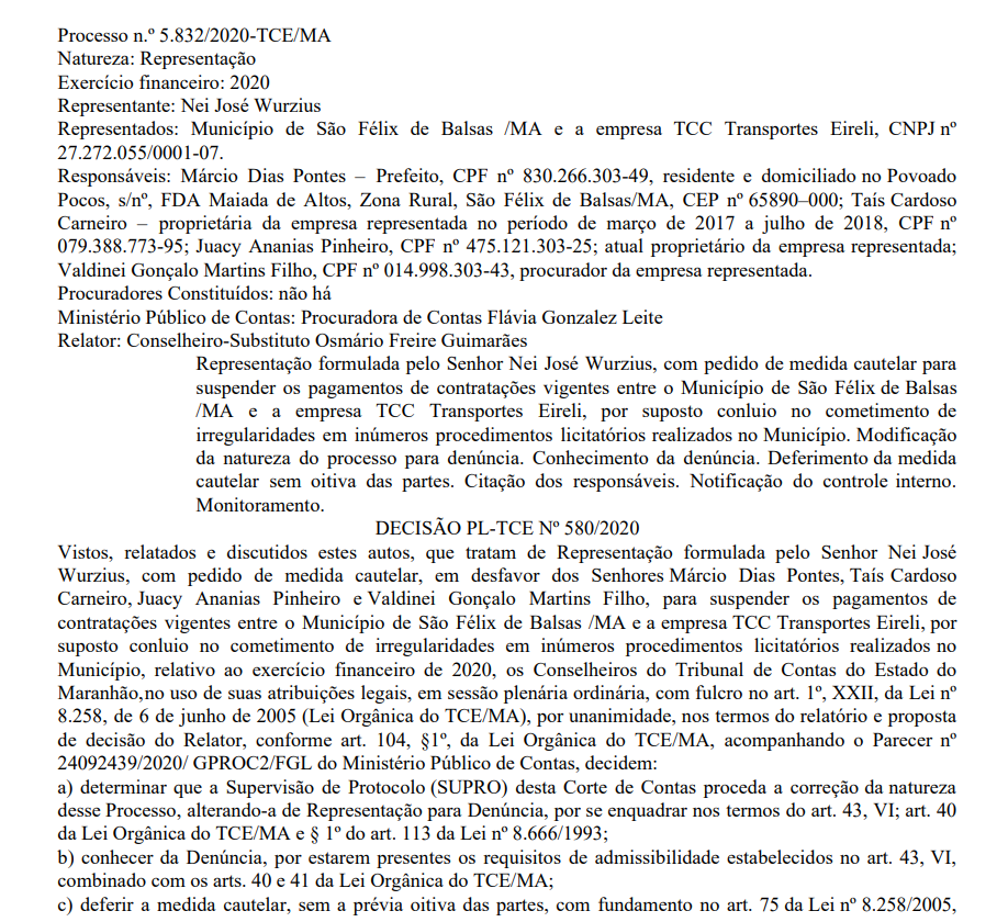 Segundo o documento obtido pelo Blog do Neto Ferreira, a decisão foi baseada na Representação formulada por Nei José Wurzius, com pedido de medida cautelar, para suspender os pagamentos de contratações vigentes entre a Prefeitura e a TCC Transportes Eireli, por suposto conluio no cometimento de irregularidades em inúmeros procedimentos licitatórios do exercício financeiro de 2020.