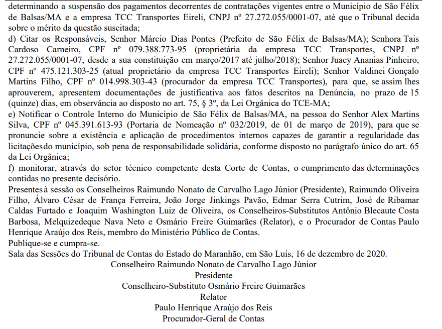 A Corte determinou ainda a citação do prefeito Márcio Dias Pontes, da ex-proprietária da TCC, Tais Cardoso Carneiro, do atual dono da empresa Juacy Ananias Pinheiro, e do procurador da TCC, Valdinei Gonçalo Martins Filho, para que apresentem documentações de justificativa aos fatos descritos na Denúncia, no prazo de 15 dias.