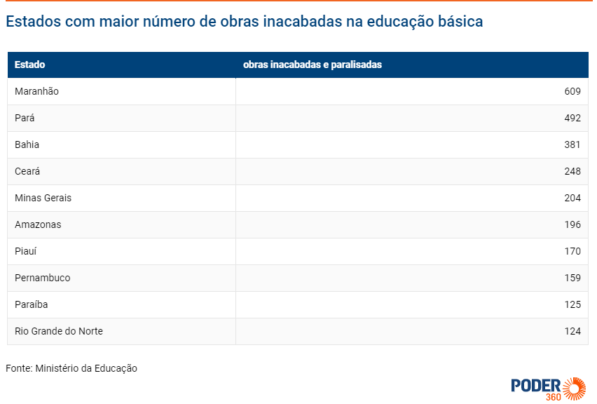 Segundo dados do MEC, das 2.740 obras inacabadas na educação básica, 609 estão no Maranhão, que lidera o ranking, em seguida vem o Pará, Bahia, Ceará e Minas Gerais.