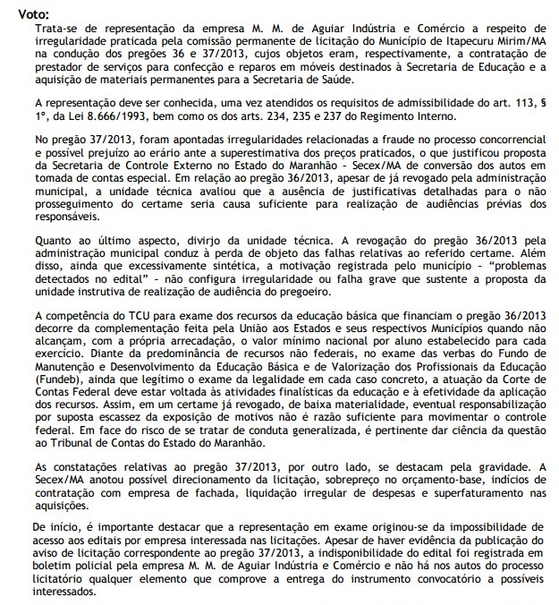 Segundo o TCU, as constatações são gravíssimas. Entre elas estão: a Prefeitura de Itapecuru-Mirim direcionou a licitação durante o pregão 37/2013. Foram verificados, ainda, sobrepreço no orçamento‐base, indícios de contratação com empresa de fachada, liquidação irregular de despesas e superfaturamento nas aquisições, além da não divulgação do processo em veículos de comunicação.