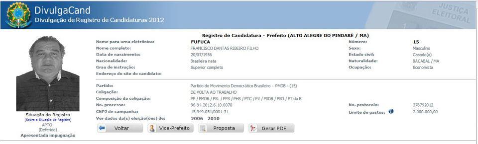 A justiça eleitoral deferiu ontem a candidatura de Fufuca Dantas (PMDB) a prefeito de Alto Alegre do Pndaré. A decisão está no sistema de divulgação de candidaturas (Divulgacand) e põe fim ao impasse e aos boatos espalhados pelo prefeito Atemir Botelho de que Fufuca não seria candidato.