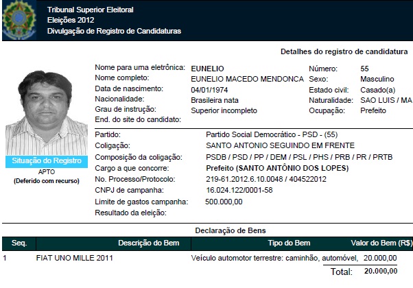 O prefeito do município de Santo Antônio dos Lopes e candidato a reeleição, Eunélio Macedo Mendonça, deve ser o único prefeito que em vez de ficar rico ficou foi mais pobre (segundo comparações de sua declaração de bens de 2008 e 2012).