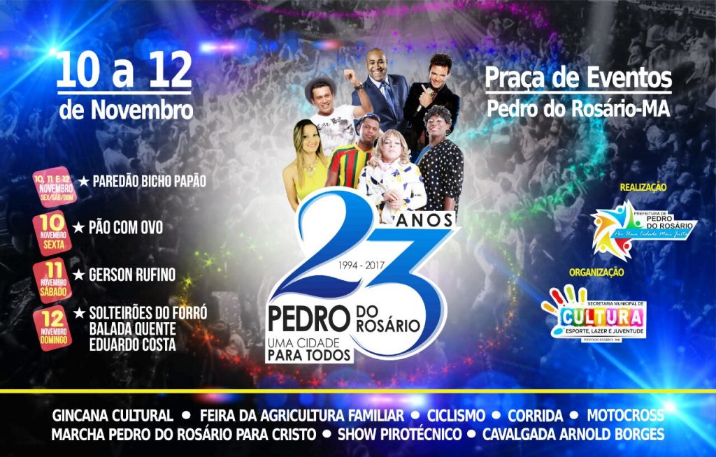 Nos dias 10, 11 e 12 de novembro, ocorrerá a Festividade de Alusão aos 23 Anos de Emancipação e Política do Município de Pedro do Rosário-Ma. Serão três dias de muita festa e diversão.