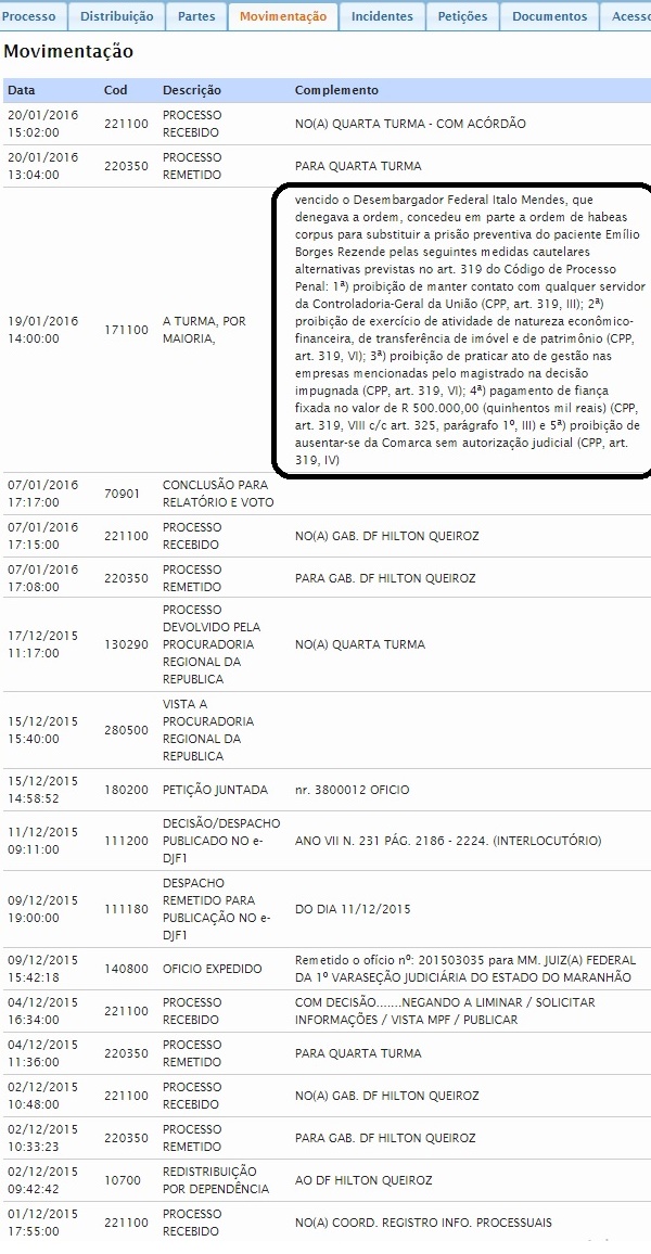 Posteriormente a saída de Ney Belo da relatoria, o processo voltou para a distribuição do TRF 1, que sorteou o desembargador Hilton Queiroz. O magistrado recebeu o caso no dia 2 de dezembro de 2015, e já no dia 4 do mesmo mês negou o pedido de habeas corpus de Emílio Rezende.