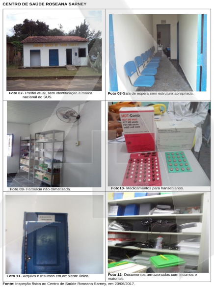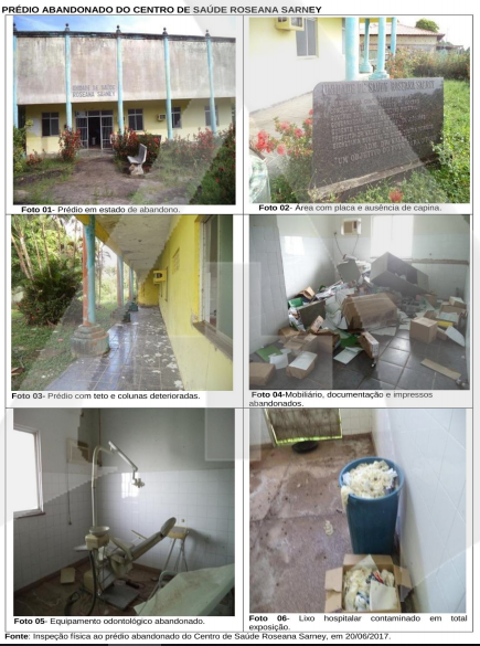 No centro de saúde Roseana Sarney, os auditores detectaram que o prédio antigo está abandonado, com teto, paredes e piso em deterioração, gabinete odontológico abandonado, ambientes com sujeira, acúmulo de materiais, mobiliários e documentação no chão, lixo hospitalar exposto e área externa precisando de capina.