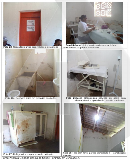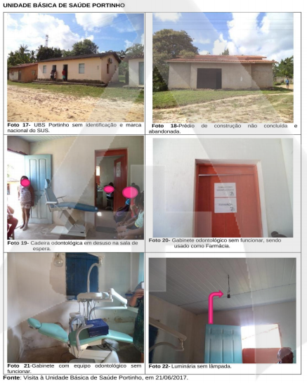 Na unidade de saúde Portinho, os fiscalizadores também encontraram deficiências, como o banheiro único sem higienização, piso de cimento bruto, sanitário sem assento e um tanque sem tampa de proteção, inexistência de sala de vacina, consultório único para médico e enfermeiro, além desses a mesa ginecológica está servindo de apoio para a balança infantil e aparelho de pressão em desuso.