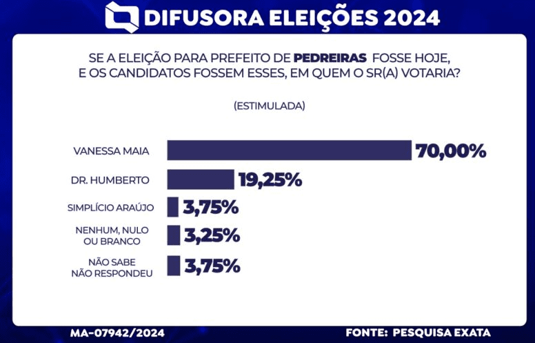 Vanessa Maia, atual prefeita do município de Pedreiras, candidata à reeleição pelo União Brasil, lidera a disputa pela prefeitura de Pedreiras com 70% das intenções de voto, segundo nova pesquisa Exata/TV Difusora divulgada na terça-feira, 24.