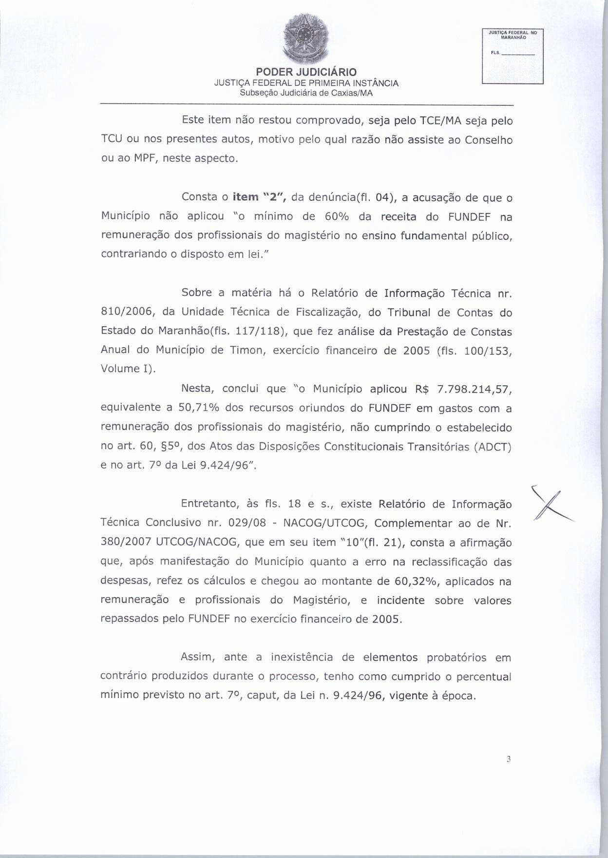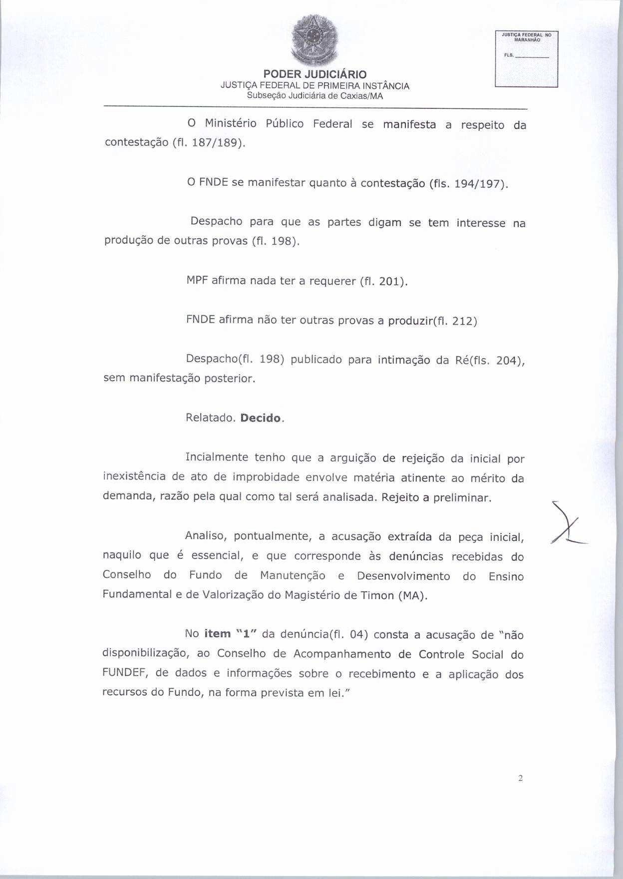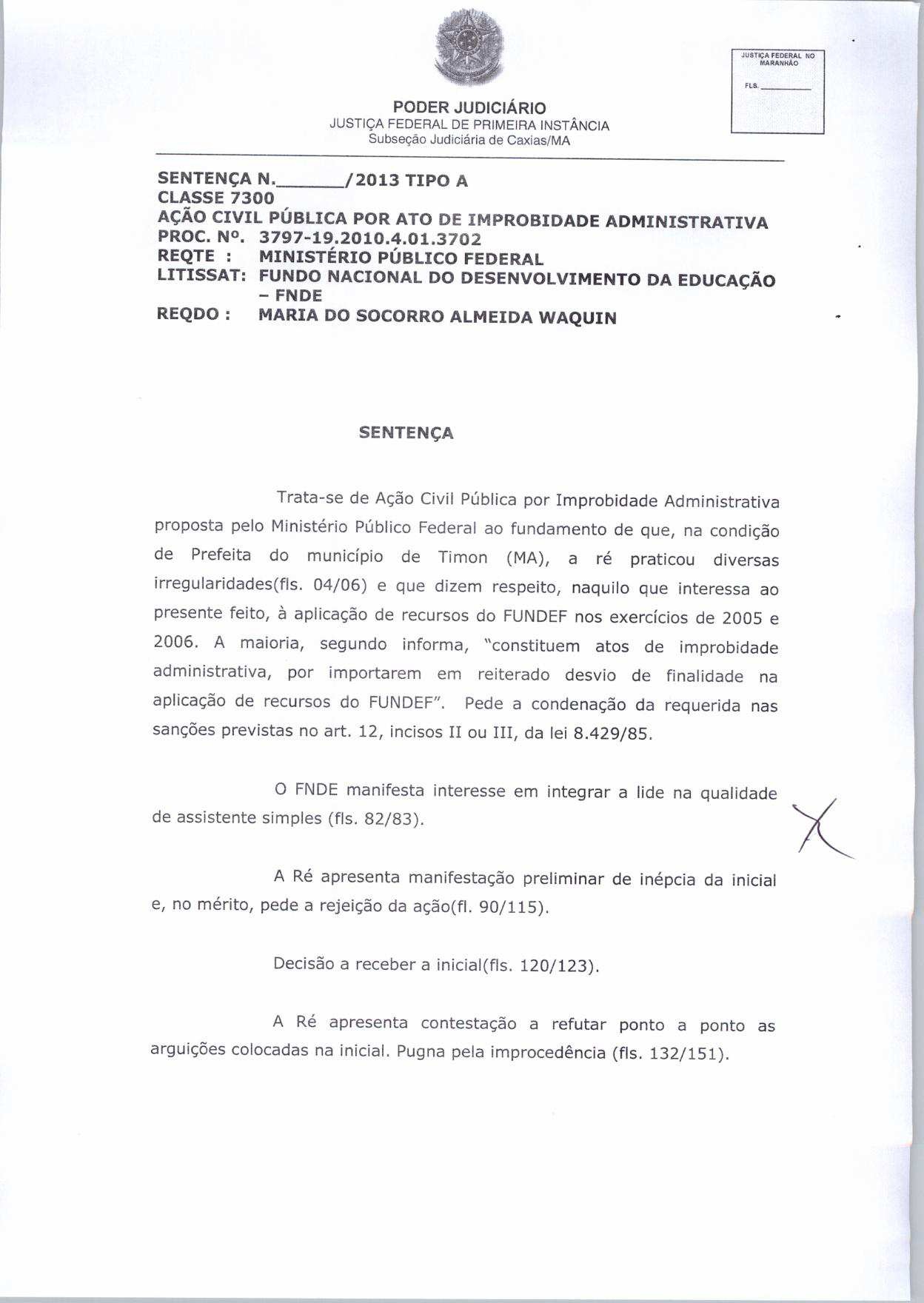 O blog publica abaixo a condenação da ex-prefeita de Timon, Socorro Waquim (PMDB), na Justiça Federal do Maranhão. De acordo com o magistrado, Waquim é acusada de não disponibilizar, ao Conselho de Acompanhamento de Controle Social do FUNDEF, dados e informações sobre o recebimento e aplicação dos recursos do Fundo, na forma prevista em lei”.