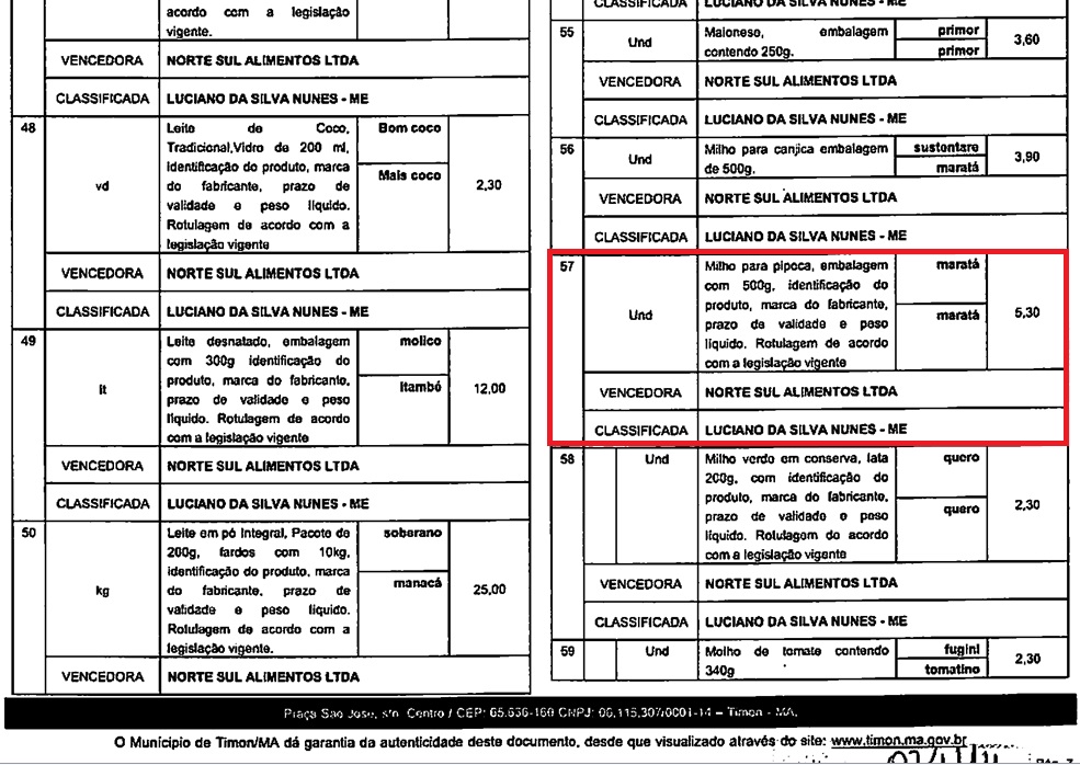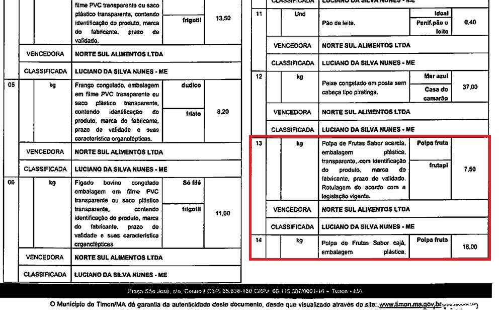 Documento do processo licitatório da merenda escolar de Timon.