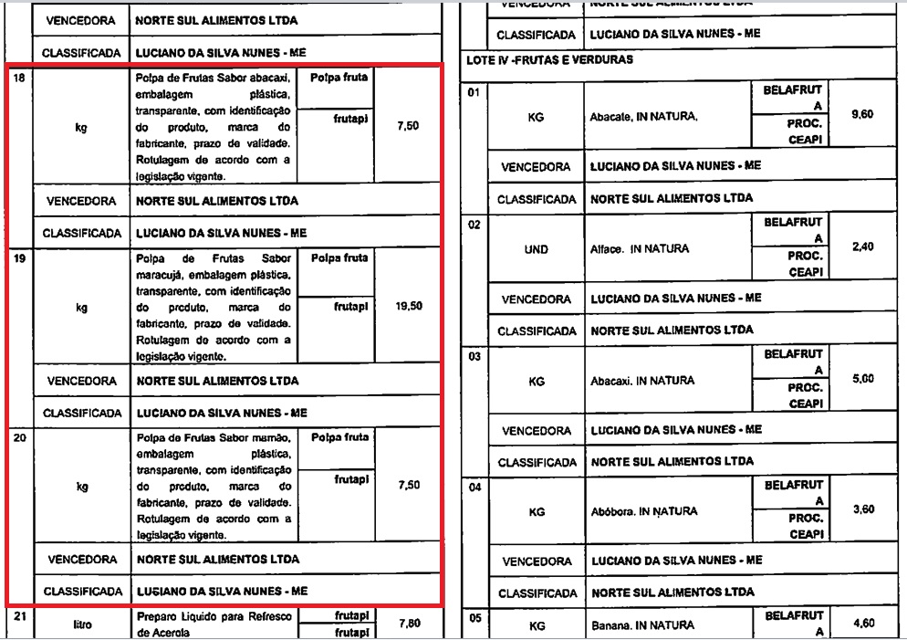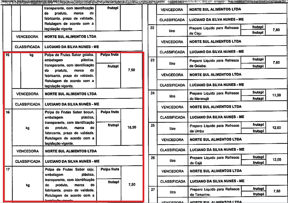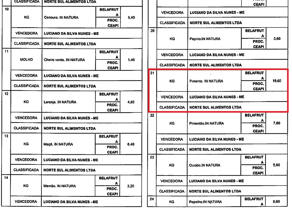 Por exemplo: 1 pacote de café de 250g não custa R$ 17,50; 1 pacote de milho para pipoca 500g não é cobrado o valor de R$5,30 nos supermercados; polpas de frutas com sabores diferentes variam entre os valores de R$ 7,50, R$ 16,00 e R$ 18,00; o valor da pimenta no processo foi aprovado no processo de R$ 19,60.