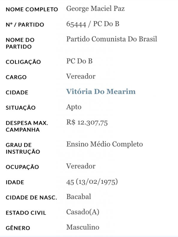 Com mandato de vereador em Vitória do Mearim, George Maciel (PCdoB) também ocupa outro cargo cargo público na Prefeitura de Igarapé do Meio.