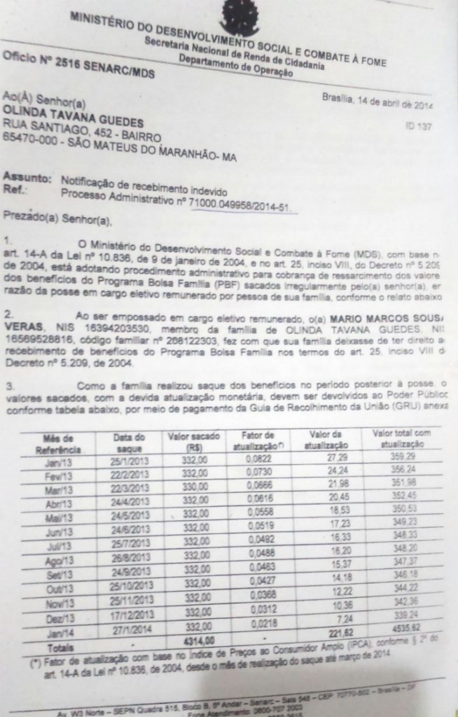 O benefício para a esposa do vereador, segundo mostra documento abaixo, levou o Governo Federal a adotar procedimento administrativo para cobrança de ressarcimento dos valores do Beneficio do Programa Bolsa Família, sacados irregularmente. Este caso envolvendo a família do vereador deverá ser repassado à Polícia Federal e ao Ministério Público Federal que devem tomar as medidas cabíveis.