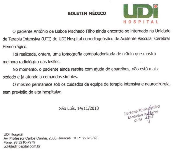 Vereador Lisboa atende a comandos simples, diz UDI 14/11/201314/11/2013 | PÁGINA PRINCIPAL, Notícias Em nota encaminhada ao Blog do Neto Ferreira, o Hospital UDI informou o novo quadro de saúde do vereador de São Luís Professor Lisboa. Na nota, o parlamentar teria deixado o quadro de coma e responde a alguns comandos dos médicos. Navegação de Post Ex-prefeita de Miranda do Norte é cobrada a devolver mais de R$ 2 milhõesRigo agradece Roseana e comemora asfaltamento de rodovias estaduais