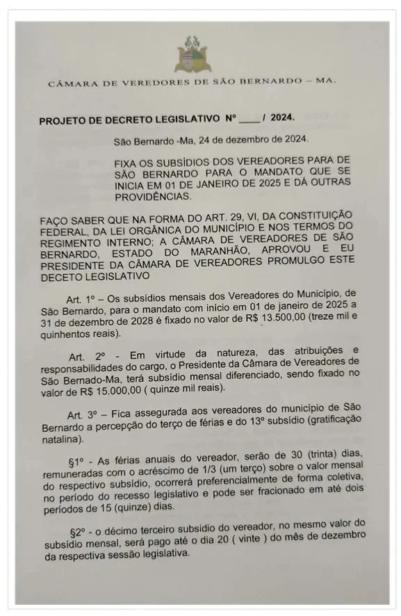 De acordo com o projeto, os parlamentares deixarão de receber R$ 7.590,00 (sete mil, quinhentos e noventa reais) e ganharão 13.500,00 (treze mil e quinhentos reais) Enquanto o presidente da Câmara, João Mãozinha, receberá R$15.000,00 (quinze mil reais) mensalmente.