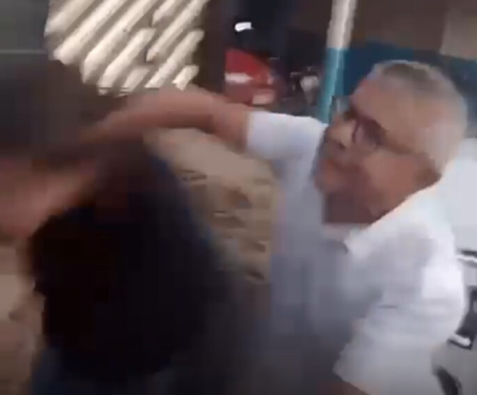 Visivelmente fora do controle, Jailson Fausto aparece nas imagens pegando pelo pescoço e cometendo a agressão física em plena luz do dia no bairro Multirão, localizado na cidade vizinha Pedreiras.