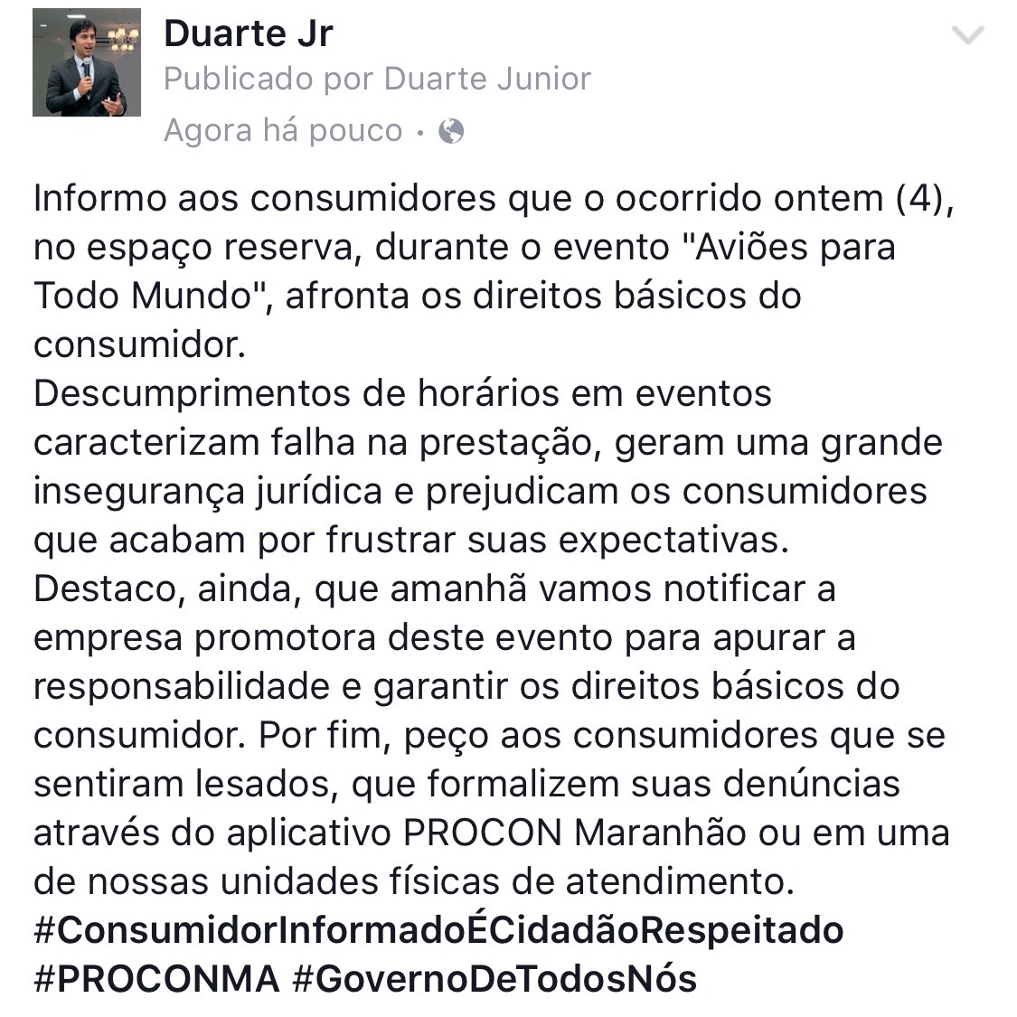 O diretor da Gerência de Proteção e Defesa do Consumidor (PROCON-MA), Duarte Júnior, informou em sua rede social, que vai notificar o responsável pelo evento, acusado de afrontar os diretos básicos do consumidor, descumprindo o horário e caraterizando falha na prestação.