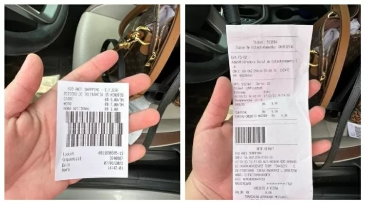 O cliente Joel Castro mostrou o comprovante no valor de R$ 9,00 referente ao estacionamento — o pagamento foi efetuado às 16h14m. O incêndio no shopping teve início por volta das 16h, segundo o Corpo de Bombeiros.