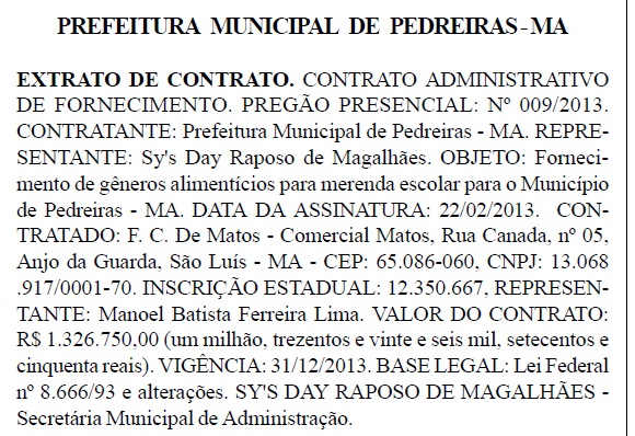 Ainda não satisfeito com os gastos, Chicote firmou outro contrato milionário também no mesmo mês com a empresa F.C. de Matos – Comercial Matos, para fornecimento de gêneros alimentícios para merenda escolar.