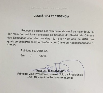 A decisão tomada há pouco pelo presidente interino será validada assim que publicado. Segundo o site Folha, membros do governo petista se deslocaram à casa de Maranhão para tentar fazer com que ele permanecesse com o mesmo proposito de ser contra o impeachment. Waldir voltou atrás da decisão e revogou a sua propria tentativa de anular o impeachment por temer uma possivel expulsão do PP.