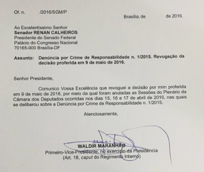 Após gerar um clima de instabilidade na econômica brasileira, inclusive, tenso na Câmara dos Deputados e Senado Federal, o presidente interino Waldir Maranhão (PP), comunicou na noite de segunda-feira (09), a integrantes do Partido Progressista, que encaminhou oficio para o Senado tratando da revogação da decisão que anulava sessão da qual foi votado à abertura do processo de impeachment da presidente Dilma Roussef.