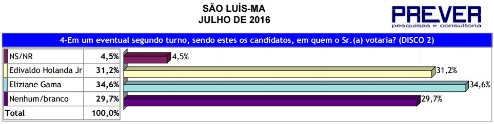 Em um confronto entre Eliziane e Edivaldo, a deputada federal ganharia no segundo turno com 34,6%, contra 31,2% das intenções de votos. Não voltaria em nenhum ou em branco ficou com 29,7% e não sabe ou não respondeu com 4,5%