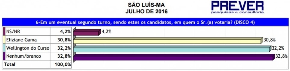 Já uma disputa entre Gama e Wellington, o candidato do PP vence com 32,2%, e Eliziane perderia com 30,8%. Não voltaria em nenhum ou em branco ficou com 32,8% e não sabe ou não respondeu com 4,2%.