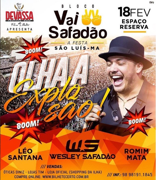 O cantor Wesley Safadão vai invadir São Luís é será uma das atrações principais do bloco do ‘Vai Safadão’, na noite deste sábado (18), que ainda contará com swing do fenomenal Léo Santana e Romim Mata.