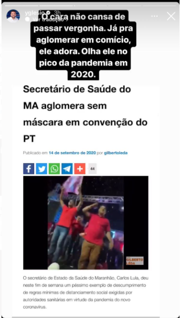 Em uma postagem no Instagram Story, Yglésio disse que o ex-secretário de Saúde não cansa de passar vergonha e lembrou dos eventos políticos dos quais Lula participou sem usar qualquer tipo de proteção durante o pico da pandemia da Covid-19.