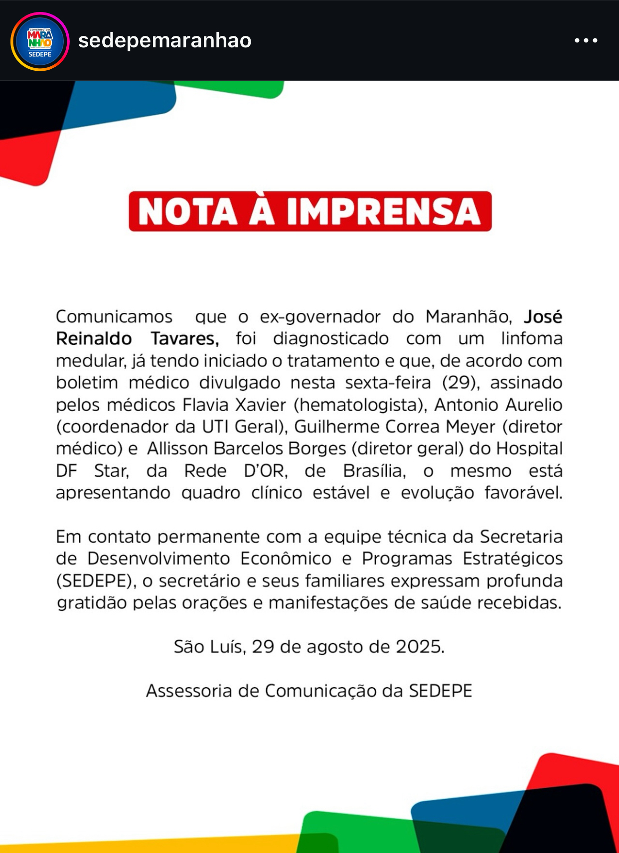 O ex-governador do Maranhão e atual secretário de Estado de Desenvolvimento Econômico e Programas Estratégicos, José Reinaldo Tavares, foi diagnosticado com um linfoma medular e permanece realizando tratamento no Hospital DF Star, da Rede D´OR, em Brasília.