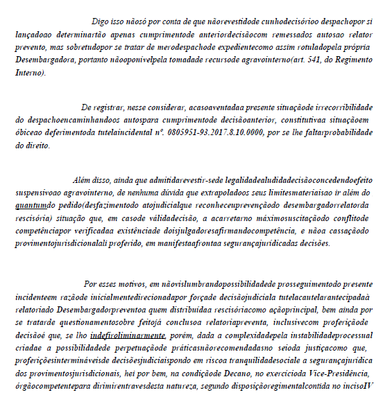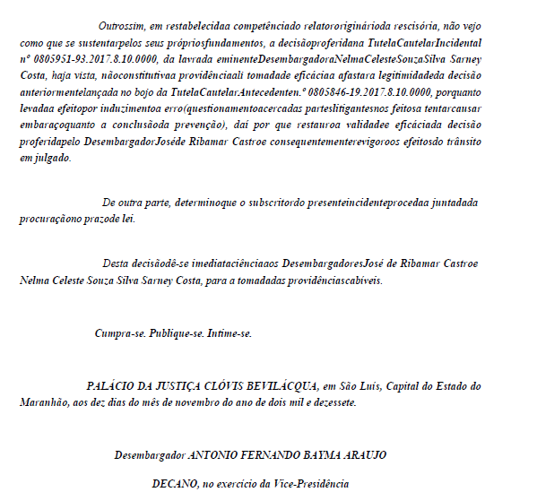 “Outrossim, em restabelecida a competência do relator originário da rescisória, não vejo como que se sustentar pelos seus próprios fundamentos, a decisão proferida na Tutela Cautelar Incidental nº 0805951-93.2017.8.10.0000, da lavrada eminente Desembargadora Nelma Celeste Souza Silva Sarney Costa, haja vista, não constitutiva a providência ali tomada de eficácia a afastara legitimidade da decisão anteriormente lançada no bojo da Tutela Cautelar Antecedente n.º 0805846-19.2017.8.10.0000, porquanto levada a efeito por induzimento a erro(questionamento acerca das partes litigantes nos feitos a tentar causar embaraço quanto a conclusão da prevenção), daí por que restauro a validade e eficácia da decisão proferida pelo Desembargador José de Ribamar Castro e consequentemente revigoro os efeitos do trânsito em julgado.”, despachou Antônio Bayma.